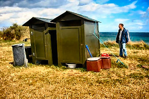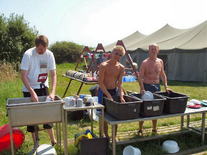 • et badetelt og en aflukket brusekabine med varmt vand (gasopvarmet)